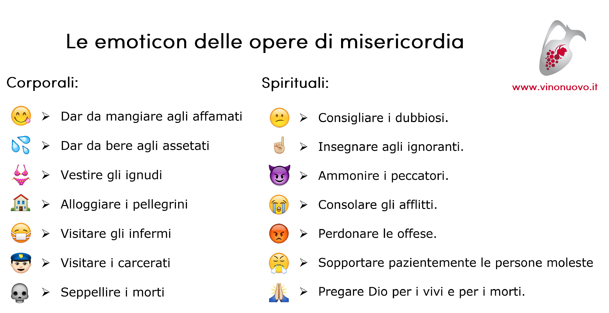 Proprio questo passaggio della misericordia dalla sola dimensione verticale della relazione con Dio a quella orizzontale delle relazioni con gli altri ci ha permesso di introdurre il tema delle opere di misericordia e, anche qui, abbiamo chiesto ai ragazzi di provare ad esprimere ciascuna di esse attraverso le emoticon. Questo il risultato: