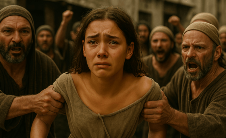 Mentre ti conducevano al luogo dove, in nome di Dio, il massacro di una donna avrebbe riportato giustizia, passaste di fianco a una piccola folla, nei pressi del tempio. “Guardate là, c’è il Nazareno”, “Portiamola da lui, che si crede il Cristo”, “Vediamo che dice”, “È la volta buona che finisce anche lui lapidato!”. Ti gettarono in mezzo e puntarono il dito.