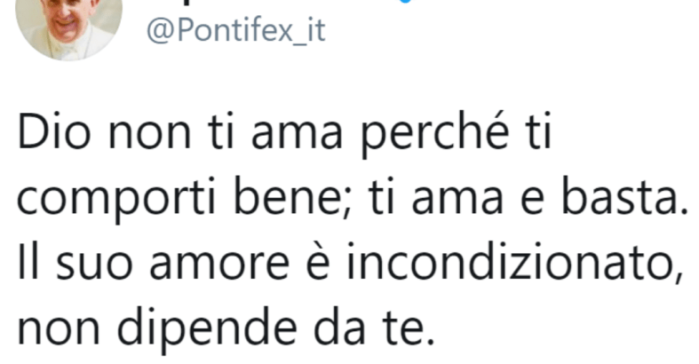 È un tweet che Papa Francesco ha postato qualche giorno fa. Niente di sconvolgente a prima vista: l’amore gratuito di Dio che previene ogni nostra azione e la nostra stessa vita, è una verità che la fede cristiana ci consegna da sempre. Ma andando scorrere le risposte sotto il post mi sono reso conto di quanta fatica facciamo a credere in un amore gratuito che non chiede niente in cambio.