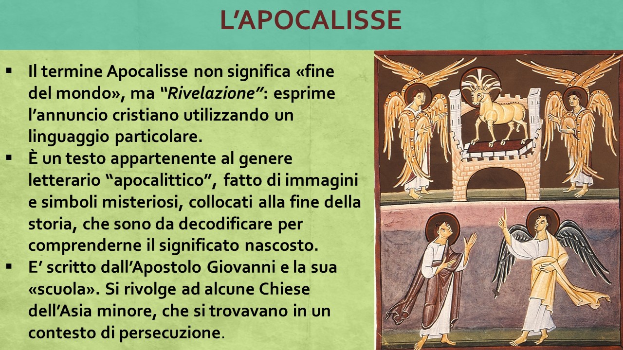 Il libro dell’Apocalisse è scritto dalla scuola che fa riferimento all’evangelista Giovanni, a cavallo tra il primo e il secondo secolo. Si apre con sette lettere a sette Chiese dell’Asia minore, per poi proseguire con diverse immagini enigmatiche che si susseguono e chiedono di essere interpretate per poterle cogliere nel loro significato autentico.