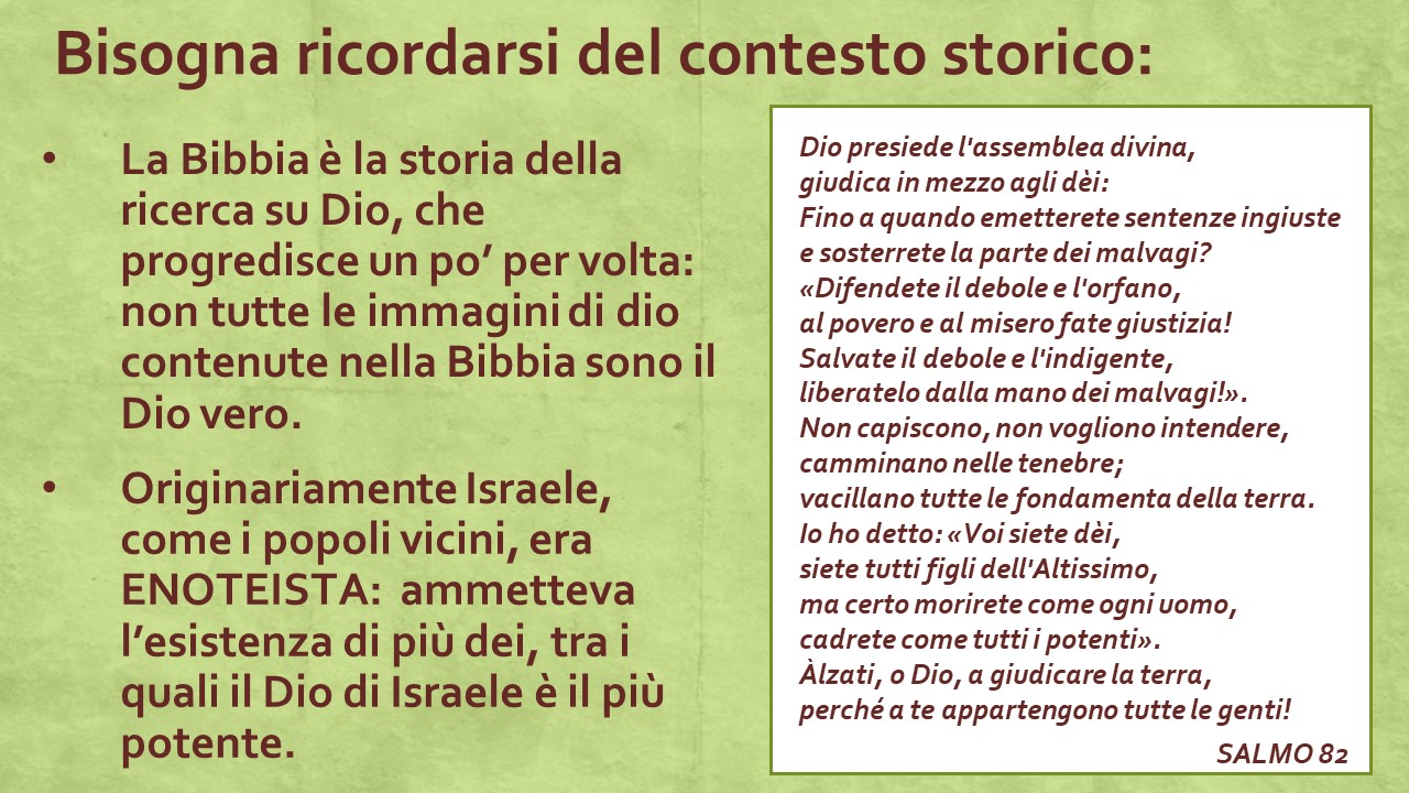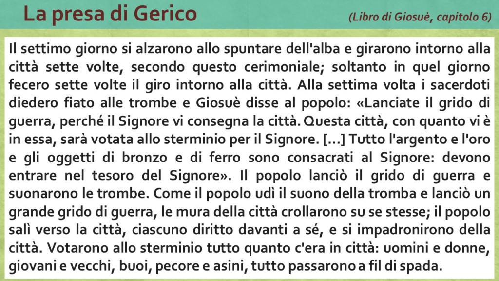 – Il secondo aspetto che permettere di comprendere episodi come quello di Gerico riguarda una delle caratteristiche della religiosità antica, ossia l’enoteismo. L’ebraismo è monoteista, ma non lo è sempre stato in senso stretto. Come ogni altra religione antica anche Israele credeva infatti che ogni popolo avesse le proprie divinità. Il Dio di Israele è uno solo e si chiama JHWH, ma poi ci sono le divinità degli altri popoli, che esistono a loro volta e sono in competizione con JHWH. L’idea prettamente monoteista per la quale esiste un solo Dio in tutto l’universo, appartiene all’evoluzione più recente dell’ebraismo (dopo l’esilio a Babilonia), in precedenza anche Israele crede nell’esistenza delle divinità di ciascun popolo. Per quanto nella Bibbia troviamo soprattutto descritta la fede monoteista, restano tracce dell’enoteismo precedente, come ad esempio il salmo 82, riportato nella slide, nel quale Dio è rappresentato seduto nell’assemblea dove siedono tutte le divinità della terra. L’enoteismo spiega perché troviamo racconti in cui Dio comanda la conquista di un altro popolo: in questa fase Dio è il Dio di Israele, non degli altri popoli.