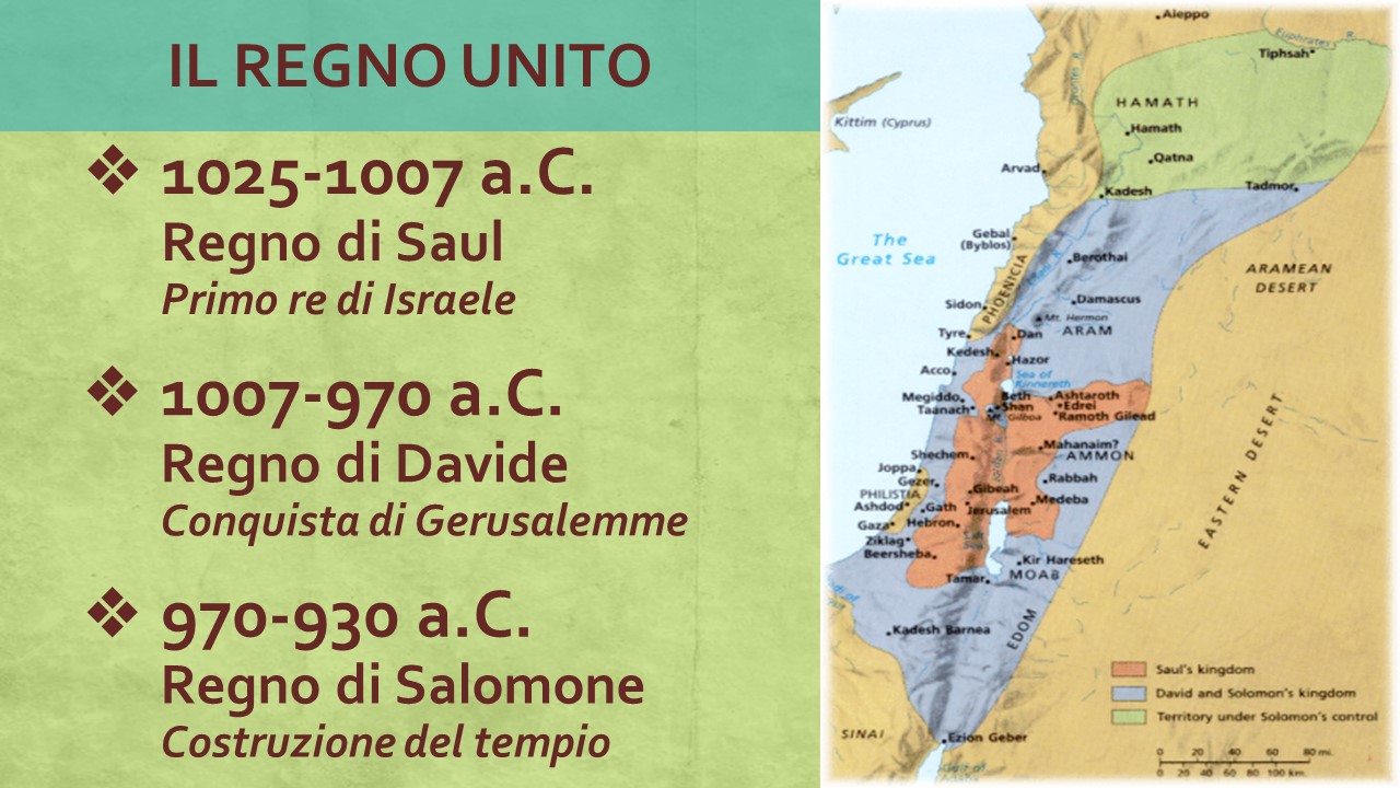 Da ultimo qualche accenno su Salomone, ricordato soprattutto per la sua proverbiale sapienza. Si possono leggere i due racconti più significativi da questo punto di vista che troviamo in 1Re 3: quello in cui Salomone chiede a Dio il dono della sapienza e quello in cui deve giudicare il caso delle due donne madri l’una di un figlio morto e l’altra di un figlio vivo. Con Salomone il regno di Israele raggiunge la sua massima espansione. La cartina riportata nella slide evidenzia il progressivo allargarsi del territori conquistato nel periodo del regno unito. Ma soprattutto Salomone fa costruire il tempio di Gerusalemme.
