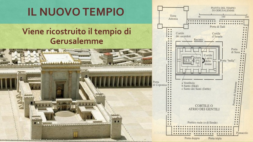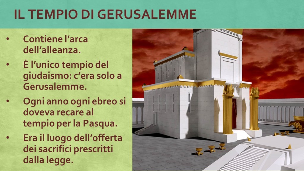 Mentre scorrono le immagini spiego la struttura dell’edificio, i portici, le vasche per le abluzioni, l’altare dei sacrifici, il pinnacolo, la prima sala e poi la sala più interna, il Santo dei santi, dove era conservata l’arca dell’alleanza che conteneva le tavole della legge. Preciso come il tempio fosse diverso dalle sinagoghe. Le sinagoghe erano il luogo di preghiera ordinario, un po’ come le nostre chiese. Il tempio era un luogo straordinario, dove si svolgevano dei riti diversi da quelli delle sinagoghe. In questo l’ebraismo era diverso dal cristianesimo, dove in ogni chiesa, grande o piccola, si svolgono i medesimi riti, ed era più simile all’Islam che ha nel santuario de La Mecca un luogo particolare di culto, dove si svolgono riti diversi da quelli che si vivono in moschea. Ai nostri occhi ciò che avveniva al tempio è assimilabile più a una macelleria che a un luogo di culto. Nel tempio infatti si facevano i sacrifici, in particolare in occasione della Pasqua, quando ogni ebreo era tenuto a salire al tempio. In questo periodo la popolazione di Gerusalemme aumentava a dismisura. I pellegrini, che venivano da tutte le regioni di Israele, normalmente non portavano con sé gli animali da sacrificare, ma li compravano nei pressi del tempio. Per questo intorno al tempio era allestito un grande mercato in cui si poteva acquistare quanto si offriva per il sacrificio. È dentro questa cornice che si può ad esempio comprendere l’episodio in cui Gesù scaccia i mercanti dal tempio (Mc 11,15-19). A seconda della classe sociale di appartenenza si sacrificavano elementi più o meno costosi: le classi povere offrivano elementi vegetali, quelle di fascia media animali di piccola taglia (uccelli o ovini), i più ricchi capi di bestiame più grande (bovini). Il tempio, oltre ad essere un centro religioso, era anche una fonte di reddito importante per le classi sacerdotali, che vivevano di ciò che al tempio veniva offerto.