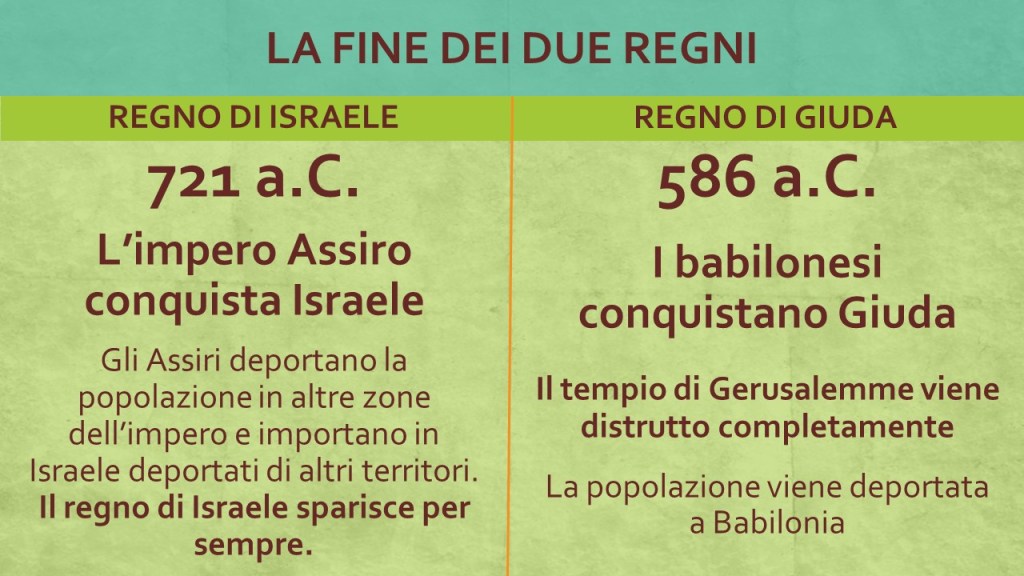 Il regno di Giuda fu più longevo. Mantenne la sua indipendenza fino al 586 a.C., quando venne conquistato dai babilonesi, guidati da Nabucodonosor, che nel frattempo avevano preso il posto degli assiri in Mesopotamia. I babilonesi arrivarono a Gerusalemme e distrussero completamente la città, incluso il tempio di Salomone e l’arca dell’alleanza contenente le tavole della legge. I babilonesi avevano però una strategia diversa di controllo dei territori occupati rispetto agli assiri: anche loro attuavano una deportazione della popolazione, ma limitata alle classi dirigenti politiche e religiose, quelle che più facilmente avrebbero potuto tirare le fila di una rivolta, ma anche quelle che potevano risultare più utili in patria per la loro levatura culturale. Per questo motivo nella Bibbia troviamo racconti con protagonisti ebrei in posizioni altolocate nella corte di Babilonia (Daniele, Ester…).