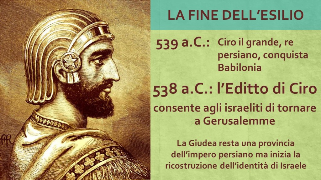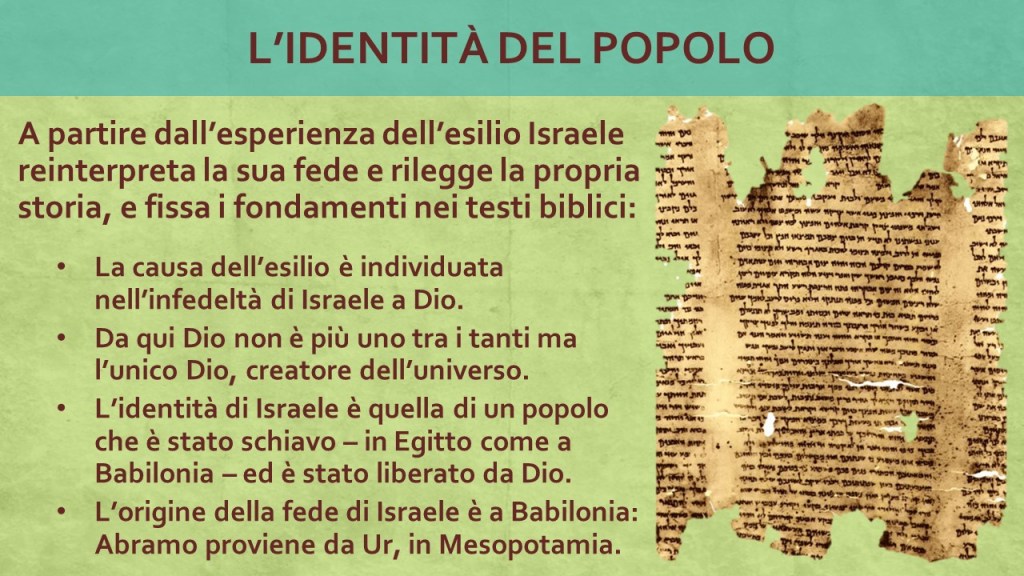 L’esperienza dell’esilio da momento di crisi si trasforma così in evento fondativo per un nuovo inizio, che dà origine al riconoscimento di una nuova identità del popolo e di Dio. Questa nuova identità Israele inizierà a codificarla e metterla per iscritto redigendo i testi della Torah: i primi cinque libri della Bibbia. In questi testi, scritti dopo il ritorno dall’esilio, troviamo la testimonianza della fede ebraica postesilica, ma proiettata indietro nel tempo, attraverso la rielaborazione di racconti più antichi tramandati dalla tradizione orale. Nella Torah i racconti antichi sono riempiti di contenuti nuovi, sono utilizzati per dire la fede di Israele nel momento in cui sono scritti: la fede che ha superato la crisi dell’esilio raggiungendo una maturità nuova. Alcuni passi sono emblematici da questo punto di vista: il libro della Genesi si apre con l’immagine del Dio creatore, un Dio descritto alla luce della maturità monoteista raggiunta dopo l’esilio; la città di origine di Abramo è Ur dei caldei, in Mesopotamia: notazione attraverso la quale emerge come l’origine della fede di Israele, la fede matura di cui parla la Torah, è in Mesopotamia, è l’esperienza dell’esilio a Babilonia; il libro dell’Esodo pone come esperienza fondativa per la fede di Israele la vicenda di un popolo schiavo che viene liberato e si incammina verso la terra della promessa, dalla quale si era allontanato: è l’esperienza che Israele ha vissuto con l’esilio e il ritorno dall’esilio. L’autore di Esodo parla dell’Egitto pensando a Babilonia.