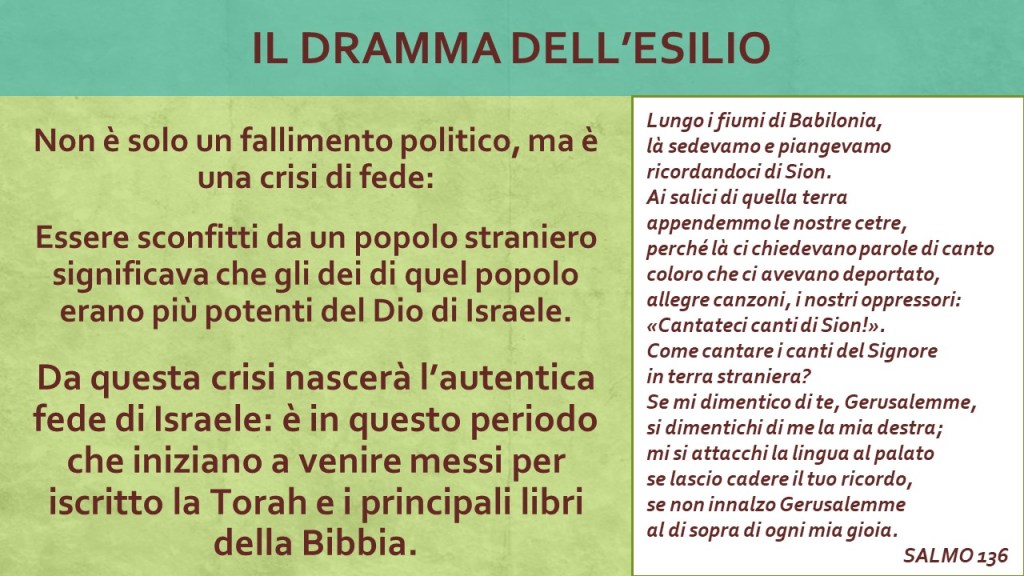 L’esperienza dell’esilio chiede a Israele di ripensare la propria fede, di fare uno scatto in avanti: le risposte di prima non sono più all’altezza della situazione presente: perché la fede di Israele, la relazione tra JHWH e il suo popolo, possa avere un futuro deve rinnovarsi in una forma nuova. È significativo sottolineare con i ragazzi come questa dinamica sia la stessa che vive ciascuno di noi crescendo: da bambini ci hanno parlato di Dio, della fede, della religione in un modo, giustamente, “da bambini”. Crescendo o il nostro modo di pensare e di vivere la fede e la relazione con Dio evolve, matura, oppure alla lunga scompare, perché non è più in grado di dire qualcosa alla nostra vita di adolescenti e adulti. Questa maturazione avviene attraverso momenti di crisi, che sono del tutto normali. Sono momenti di passaggio che conducono a una relazione con Dio nuova, all’altezza del proprio vissuto. Il problema è quando non abbiamo la pazienza di attraversare queste crisi e, per semplificare, chiudiamo i conti con Dio dedicandoci ad altro. Attraversare la crisi chiede pazienza, ma è fecondo. La vicenda del popolo di Israele ce lo testimonia.