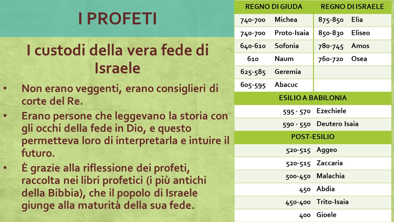 I profeti non sono dei veggenti, non hanno nulla a che fare con profezie che predicono il futuro, sfere di cristallo e altri elementi simili, tipici dell’immaginario fantasy ma non appartenenti al contesto biblico. Il loro ruolo aveva anzitutto una rilevanza politica: in un contesto nel quale politica e religione erano strettamente legate, i profeti erano i consiglieri di corte del re, che parlavano a nome della divinità. Prima di una battaglia, prima di decisioni importanti, i re consultavano i profeti per chiedere loro se la divinità fosse favorevole o avversa alla scelta in questione. Normalmente nelle corti regali erano rappresentati profeti di diverse divinità, così da ascoltare gli auspici di ciascuna. I re dovevano per questo scegliere del profeta di quale divinità fidarsi: i diversi re di Israele nei testi biblici vengono giudicati anche a partire da quanto hanno dato ascolto ai profeti di JHWH invece dei profeti di altre divinità. Nella Bibbia troviamo la testimonianza di questa compresenza di profeti che parlano a nome di divinità diverse ad esempio nel ciclo di Elia. Per sottolineare questo aspetto si può leggere insieme ai ragazzi il racconto di 1Re 18,20-40, narrativamente interessante, quando Elia sfida i profeti di Baal per dimostrare che JHWH è il Dio vero; racconto molto potente che si conclude con lo sterminio da parte di Elia di tutti i profeti di Baal.