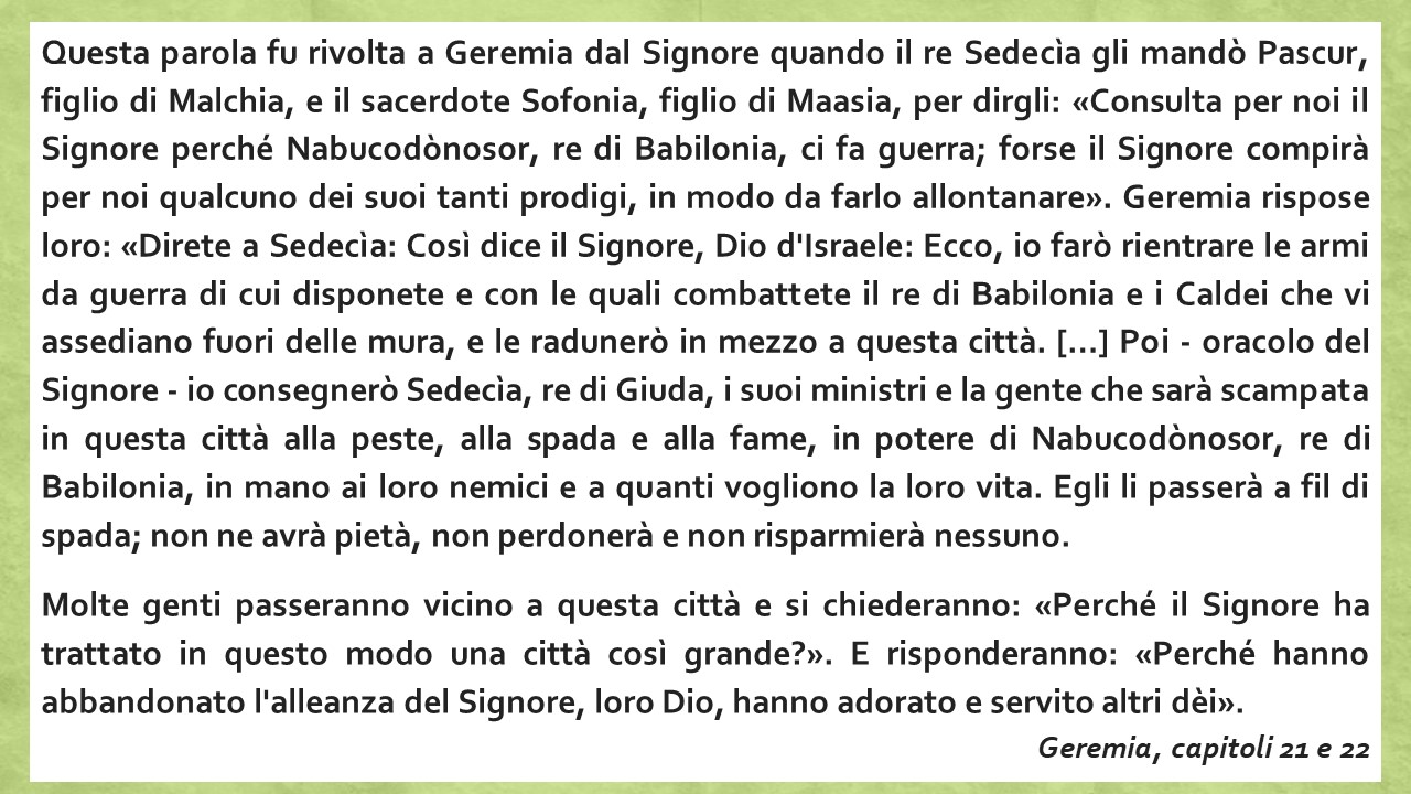 Nel secondo testo riportato nella slide invece, Geremia, guardando la realtà con gli occhi di Dio, svela il senso di ciò che è accaduto dal punto di vista di Dio. La domanda che si fanno tutti è perché Dio ha lasciato che la città venisse distrutta. Forse il Dio di Israele è inferiore alle divinità dei babilonesi? Geremia, che conosce Dio e sa cogliere nella realtà i segni del suo agire, rivela il senso teologico di ciò che è stato: Dio non è stato sconfitto dagli dei babilonesi, Dio ha punito Israele per la sua infedeltà.
