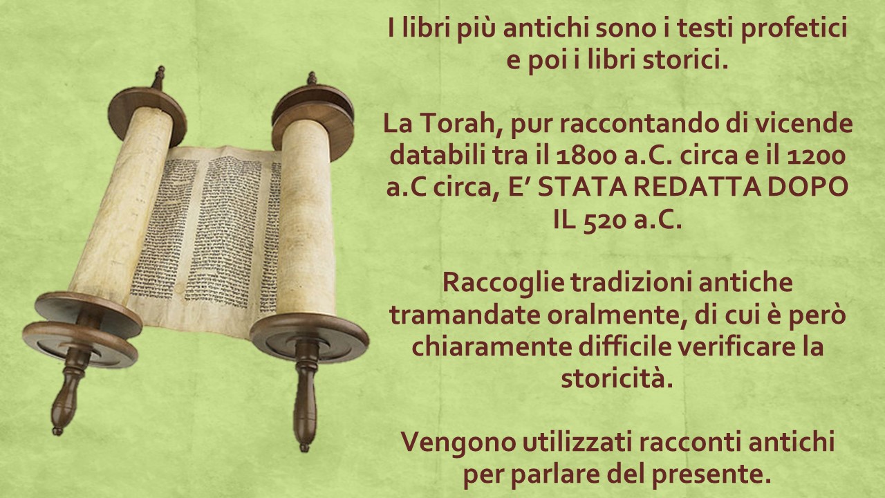 – I libri storici: testi per lo più narrativi che raccontano le vicende del popolo di Israele comprese all’incirca tra il 1200 a.C. e il 100 a.C.